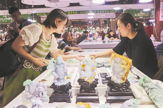当天,首届国际玉石直播节在瑞丽开幕,直播企业、主播、珠宝供应商、直播服务商等,聚焦瑞丽珠宝玉石直播产业发展成果,交流直播产业新变化。本报记者 赵黎浩 摄