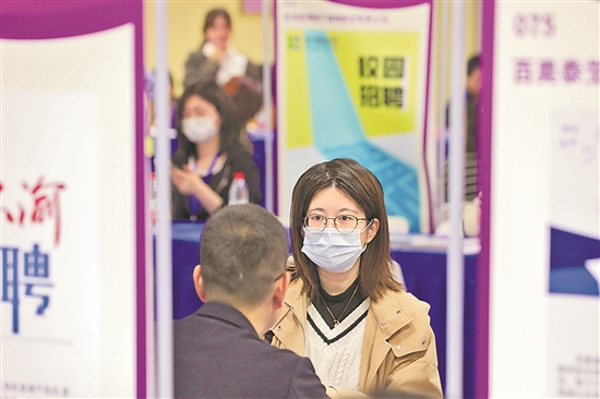 4月16日,学生(右)在春季双选会现场与用人单位交流。当日,南京大学2023届毕业生春季双选会在南京大学仙林校区举办,吸引了来自北京、上海、南京等地的180家企事业单位参会,提供近1.5万个岗位。
