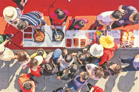 4月16日,在湖南省益阳市南县南洲广场,观众在品尝小龙虾(无人机照片)。