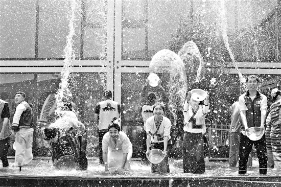 4月12日,在中建二局云南昆明博翠园项目部,一场热闹非凡的“工地版泼水节”正在上演。时值云南一年一度的泼水节,为缓解工地建设者的辛苦,让大家近距离感受节日气氛,项目部为大家开展了“工地泼水节”。活动现场,务工人员身着少数民族衣服载歌载舞,尽情徜徉在泼水节的快乐中。当天,百余名一线建设者参加了活动。本报记者 黄榆 摄