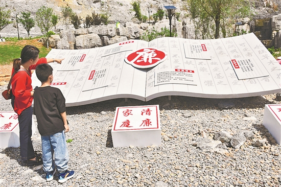 4月16日,市民带小朋友在湖南省永州市江永县廉洁文化公园内观看宣传景观。近年来,该县利用废弃矿山,通过微地形处理、艺术景观植入等措施,在原址上建起具有生态、景观、休闲与教育功能的公园,成为市民和游客休闲游玩的好去处和廉政文化宣传新阵地。本报通讯员 田如瑞 摄