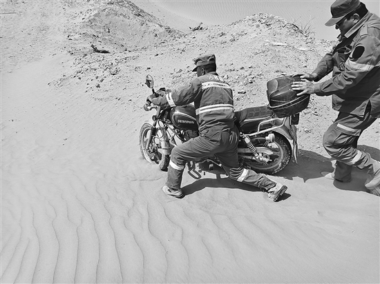 巡护途中,管护员的摩托车时常会陷入沙子里。