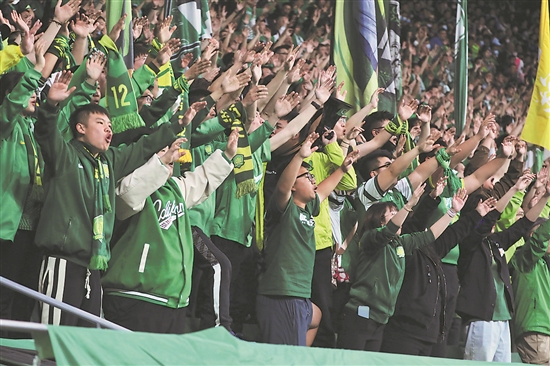 国安球迷在工体现场热情欢呼。本报记者 朱亚男 摄