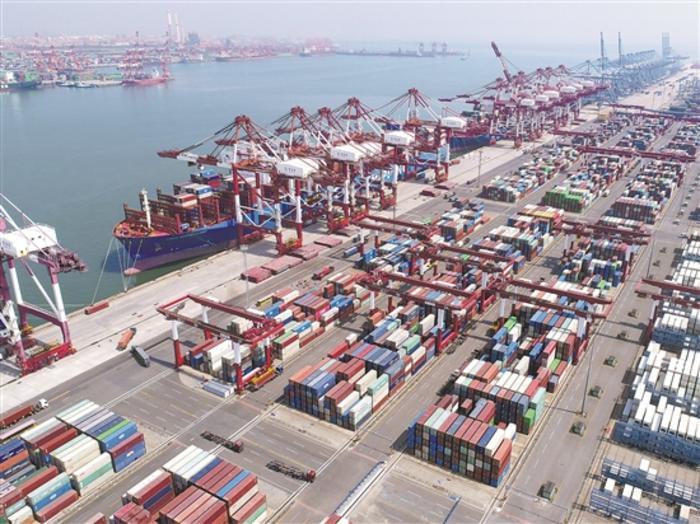 4月20日,在山东港口青岛港前湾联合集装箱码头,货轮在装卸货物。