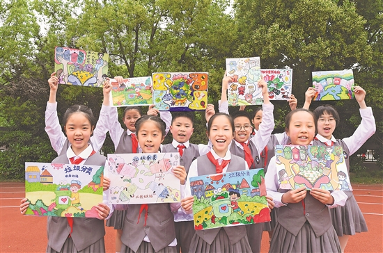4月20日,湖州新风实验小学下塘校区的学生展示自己创作的环保主题的画作。