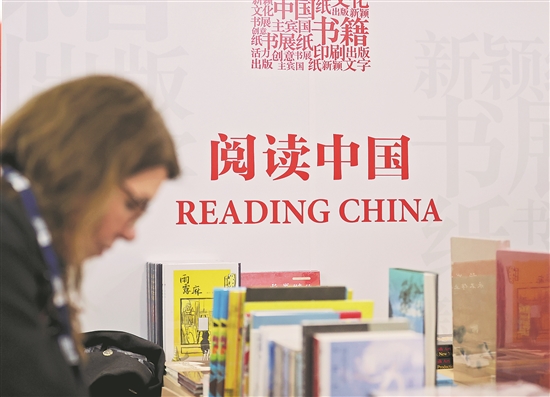 2023年伦敦书展近日在英国伦敦奥林匹亚展览中心开幕。图为读者在伦敦书展中国出版联合展台阅读。