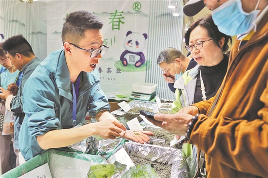 第14届北京国际茶业及茶艺博览会于4月21日至24日在北京全国农业展览馆举办。数百家茶企齐聚会场,打造一场春茶盛宴。图为博览会上,销售员在向顾客介绍自家的茶叶。本报记者 蔚可任 摄