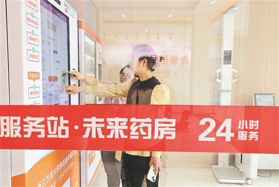 4月20日,居民在湖州市德清县舞阳街道玉屏未来社区24小时自动售药机上购买药品。