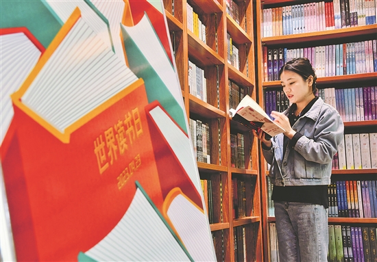 图②江苏省宿迁市泗洪县新华书店工作人员正在忙着新书上架喜迎世界读书日的到来。李佳 摄/人民图片