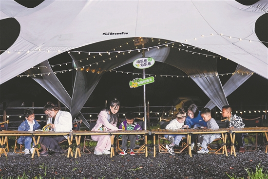 图①浙江省宁波市镇海区澥浦镇举办乡村阅读奇妙夜活动。家长与孩子一起参与图书交换、亲子阅读、共制绘本等活动。郑凯侠 摄/人民图片