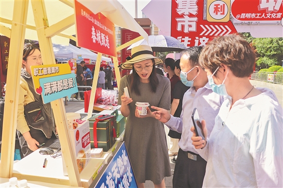 4月25日,在云南省昆明市工人文化宫,昆明市总工会、盘龙区总工会联合推出“职工普惠集市”活动,通过整合工会资源、社会资源,汇聚众多工惠卡特约合作商家,把丰富多彩的普惠活动送到职工身边。职工可领取消费券,享受购物消费优惠。图为集市一角。本报记者 赵黎浩 摄