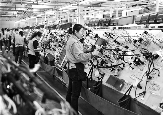 4月20日,工人在秦皇岛市海港区一家汽车电路企业的生产车间工作。