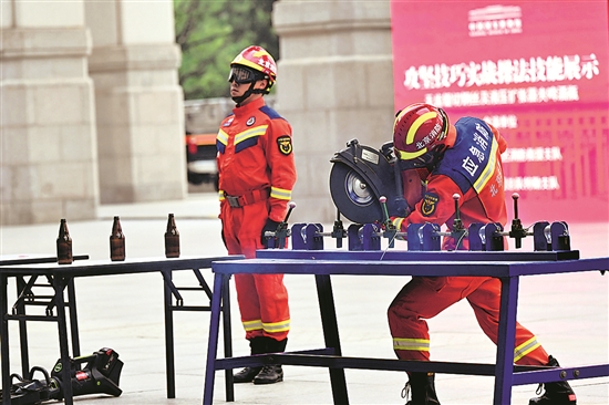4月27日,消防队员进行技能展示。当日,中国国家博物馆举行安全综合演练。 新华社记者 金良快 摄