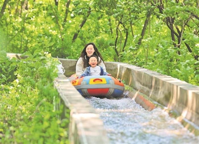 4月29日,游客在山东省临沂市沂南县铜井镇竹泉村体验丛林漂流。当日是“五一”假期第一天,人们用多种方式放松休闲,乐享假期。新华社发 (王彦冰 摄)