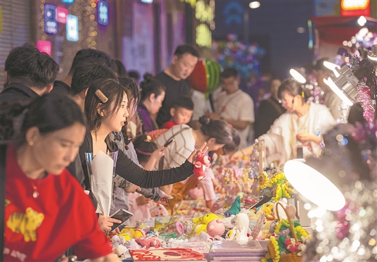 5月2日,游客在宁夏银川市金凤区阅彩城中街购买商品。