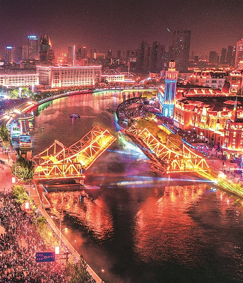 这是5月1日无人机拍摄的解放桥开启现场(无人机照片)。当晚,位于天津海河上的标志性建筑物解放桥桥梁开启,桥梁开启角度达到最大角度60度。