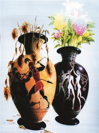 漫画家在作品中借用“化干戈为玉帛”的典故,表现战争会毁灭一切,而和平让世界和谐、昌盛。道理无须文字诠释,让人一目了然。