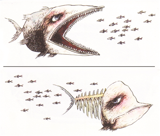 俗话常说“贪多嚼不烂”,这条暴戾恣睢的恶鱼欺凌弱小可谓毫不留情。到头来,它的残暴遭到同类痛击,肚皮被嚼得稀巴烂。