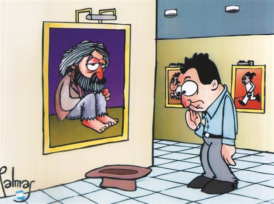 民不聊生的日子里,艺术家同样过着忍饥挨饿的生活。瞧,这位画家在自己画像前摆起乞讨的“摊位”,体味了一把“行为艺术”。
