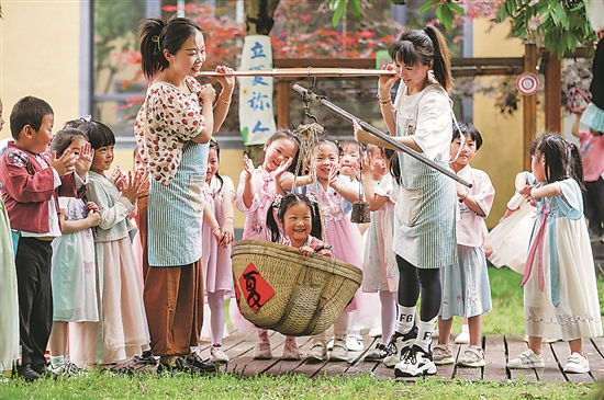 5月5日,浙江省湖州市德清县三桥幼儿园组织小朋友们开展趣味称重、做花草蛋、捏立夏狗等传统民俗活动,让孩子们在游戏中学习“立夏”知识,感受二十四节气传统民俗。本报通讯员 谢尚国 摄