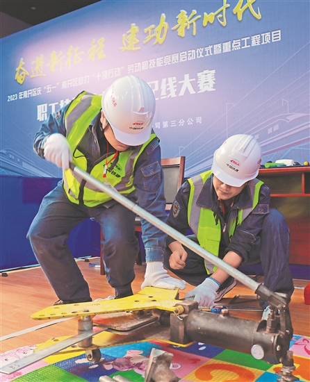日前,在天津市南开区总工会主办的2023年庆“五一”南开区助力“十项行动”劳动和技能机电设备配线大赛活动中,中建三局天津分公司和中铁津轨公司等6家企业代表队参加3个项目的比赛,中国铁建电气化局三公司代表队获得第一名。图为选手在比赛中互相配合使用煨弯机弯折钢板。