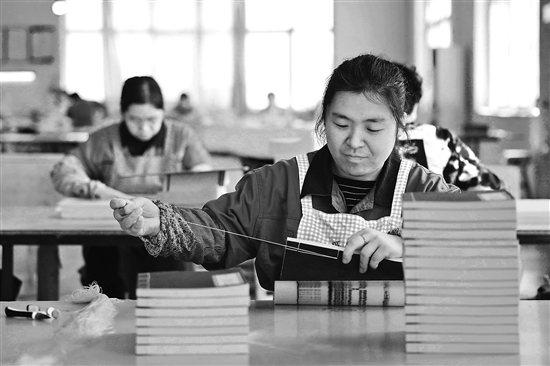 河北南宫印刷业历史悠久。齐栏、打孔、穿钉……经14道传统工序,一本线装书就制作而成。如今,南宫市继承传统工艺,引入现代化生产工序,线装书制作技艺也被列入河北省省级非物质文化遗产名录。图为工人在制作线装书。新华社记者 牟宇 摄
