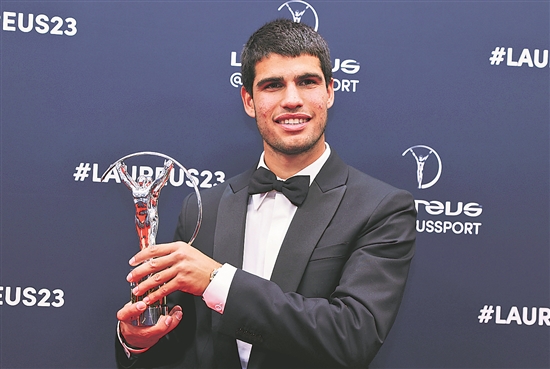 图为获得年度最佳突破奖的西班牙网球新星阿尔卡拉斯与奖杯合影。新华社记者 高静 摄