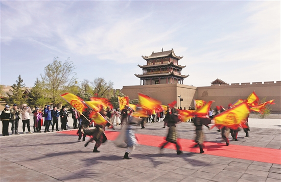 5月10日,游客在嘉峪关关城景区观看节目。