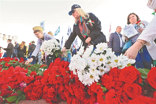 当地时间5月9日,白俄罗斯民众在明斯克的胜利广场向胜利纪念碑献花。