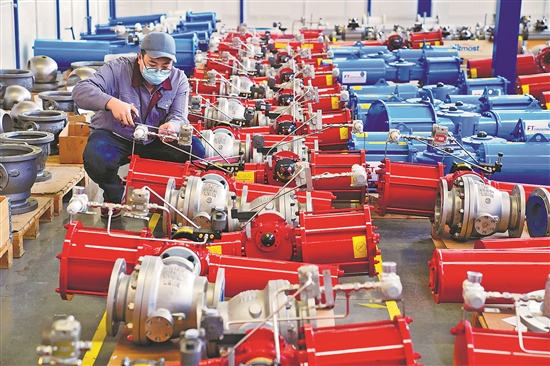 5月11日,在邹城市某流体控制技术公司,工人在质检高端流体阀。