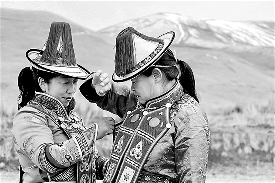 5月9日,在甘肃省张掖市肃南裕固族自治县大河乡西岔河村,巴尔斯雪山脚下的裕固族村民互相整理民族服饰。