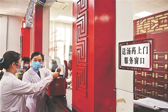 5月10日,青岛西海岸新区中医医院护士在中药房替患者领取药品。