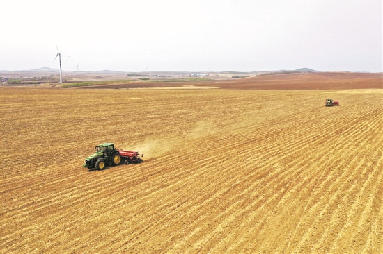 5月11日,呼伦贝尔农垦大河湾农牧场有限公司工人操作播种机械进行大豆播种作业(无人机照片)。