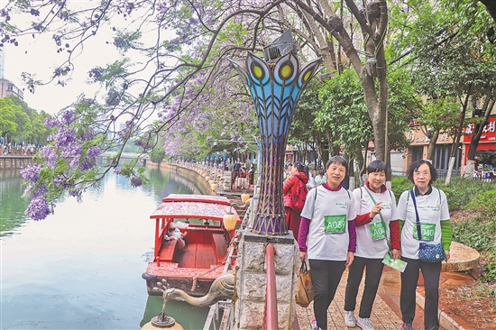 5月14日,云南省昆明市总工会、盘龙区总工会、鼓楼街道总工会、健之佳医药连锁集团股份有限公司工会联动开展2023年春城职工文体嘉年华系列活动暨第二季健之家品健健步走活动。盘龙江畔,蓝花楹盛开,当天正值母亲节,不少女职工带着孩子一起漫步花海。本报记者 赵黎浩 摄