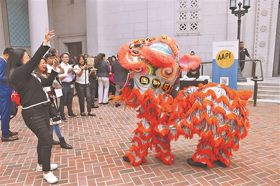 近日,在美国洛杉矶市政厅,一只舞狮在亚太裔传统月庆祝活动上和参加者互动。自1992年开始,每年5月被定为美国亚太裔传统月,全美各地都会举行庆祝活动。今年洛杉矶亚太裔传统月主题为“团结就是力量”。