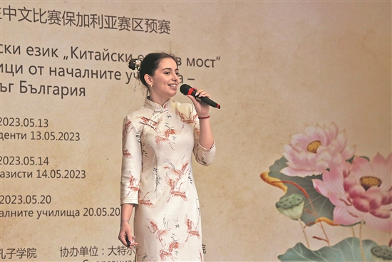 当地时间5月13日,选手在保加利亚首都索非亚参加“汉语桥”世界大学生中文比赛。 第22届“汉语桥”世界大学生中文比赛保加利亚赛区比赛13日在保首都索非亚举行。本次比赛包含主题演讲、知识问答和才艺展示三个环节。