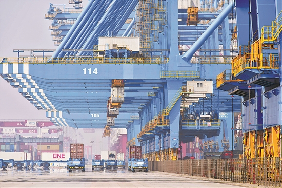 近日,山东港口青岛港全自动化码头自主研发的智能管控系统A-TOS完成提质增效技术升级,码头单台桥吊昼夜(5月14日8点到5月15日8点)在港装卸集装箱量突破1100TEU,达1192TEU,比全球同类码头的单桥吊昼夜装卸效率高出19%。新华社记者 李紫恒 摄