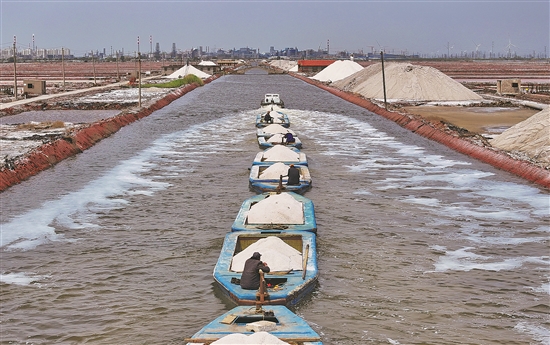 眼下正值长芦盐区海盐生产基地春盐收获季节,河北省唐山市曹妃甸区南堡盐场的工人开始扒盐作业,盐田呈现出一派繁忙景象。据介绍,南堡盐场是我国长芦盐区海盐生产基地之一,当地依托盐资源丰厚优势,大力发展盐化工产业,助推经济发展。