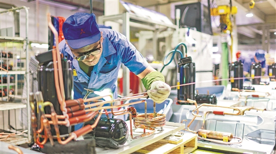 5月15日,山东省青岛市即墨区一家空调生产企业的工人在生产线上忙碌。