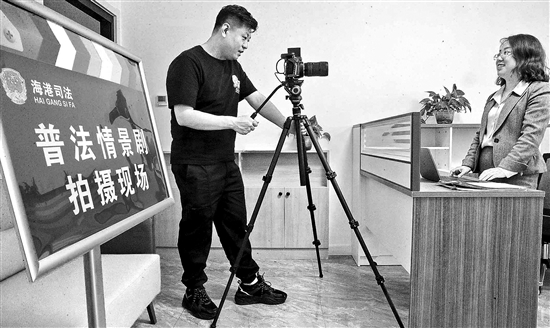 5月12日,河北省秦皇岛市海港区一家律师事务所内,普法情景剧《职场女性的维权之路》正在拍摄。近年来,海港区司法局积极优化整合法律服务资源,不断创新普法宣传载体,丰富法治文化宣传内容,充分借助现代信息技术和传播媒介,以“短视频+直播+情景剧”等形式推出普法作品,以群众喜闻乐见的方式,用群众身边事教育身边人,让“沉浸式”普法进万家。