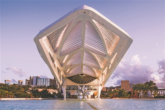 这是当地时间5月16日在巴西里约热内卢拍摄的明日博物馆。该博物馆于2015年12月向公众开放,博物馆的主题涵盖气候变化、环境保护、可再生能源、城市规划、生物多样性等领域。