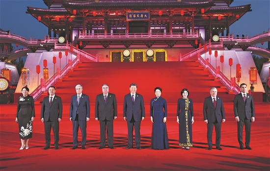 5月18日晚,国家主席习近平和夫人彭丽媛在陕西省西安市大唐芙蓉园为出席中国-中亚峰会的中亚国家元首夫妇举行欢迎仪式和欢迎宴会。宴会后,习近平夫妇同贵宾们共同观看中国同中亚国家人民文化艺术年暨中国-中亚青年艺术节开幕式演出。这是习近平夫妇在紫云楼前同贵宾合影留念。