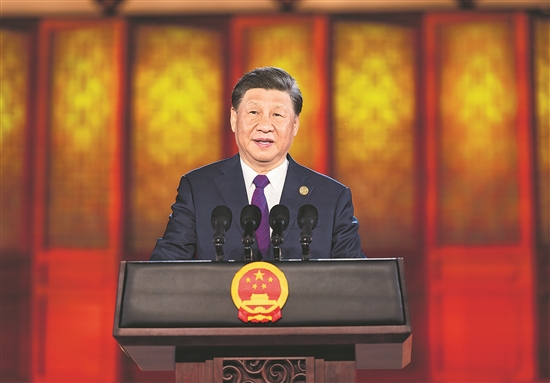 5月18日晚,国家主席习近平和夫人彭丽媛在陕西省西安市大唐芙蓉园为出席中国-中亚峰会的中亚国家元首夫妇举行欢迎仪式和欢迎宴会。宴会后,习近平夫妇同贵宾们共同观看中国同中亚国家人民文化艺术年暨中国-中亚青年艺术节开幕式演出。这是习近平发表欢迎致辞,代表中国政府和中国人民热烈欢迎中亚各国元首。