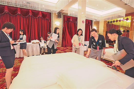 5月18日,湖南省资兴市,参赛选手参加客房服务员项目比赛。