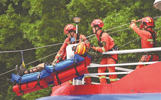5月18日,参加演练的消防人员通过绳索和漂浮担架营救“被困群众”。