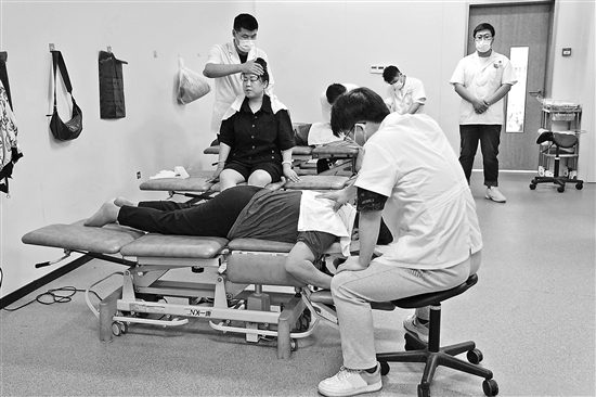 近年来,江苏省镇江市润州区大力加强基层社区卫生服务能力建设,通过建设康复联合病房、打造专家工作室、推广中医药服务等举措,提升基层医疗卫生机构服务能力,造福更多群众。图为医务人员为患者进行推拿治疗。新华社记者 马宁 摄