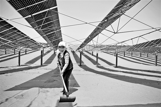 近年来,甘肃省武威市凉州区持续探索光伏治沙新模式,在腾格里沙漠重点实施立体光伏治沙产业化示范项目,建设光伏电站的同时,在光伏板下栽植耐旱沙生植物,将太阳能开发与腾格里沙漠治理有机结合,实现经济效益和生态效益双赢。新华社记者 陈斌 摄