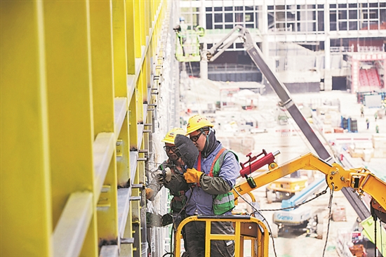 5月14日,河北雄安新区的一处工地上,电焊工正在30多米高的云梯上焊接建筑物的外立面。与地面工种不同,这些从事高空作业的电焊工不仅需要高超的技能,还得经过健康认证。为了保证施工安全,他们往往两人一组,一人负责焊接,一人负责保证物料安全,防止在焊接过程中掉落。本报记者 王伟伟 摄