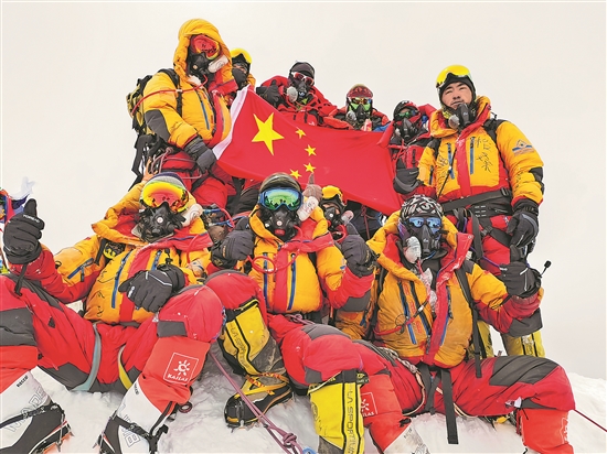 5月23日,科考登顶队员在珠峰峰顶展示国旗。