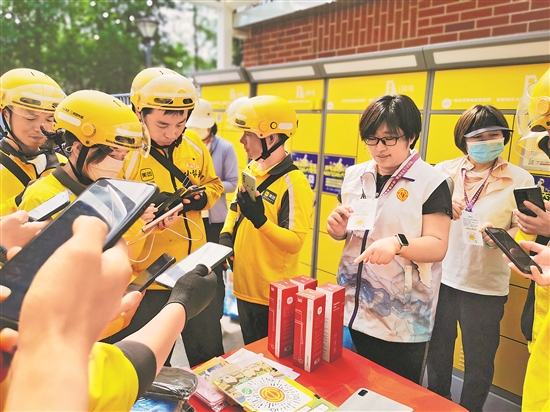 工作人员利用晨会时间,向外卖送餐员详细讲解入会流程和针对新就业形态劳动者的“六送”保障等活动,同时发放《入会宝典》《新业态劳动者权益保障》等宣传材料。